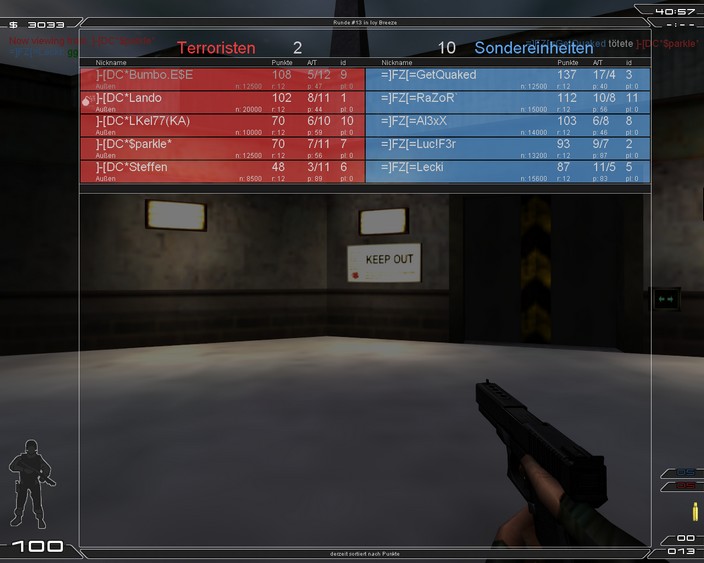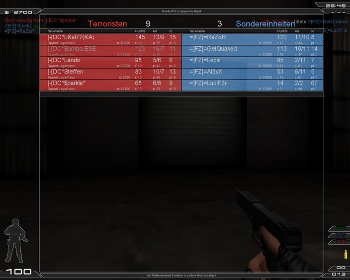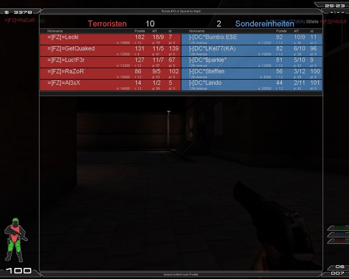 Lustiges FM indem wir mit diesmal nicht mit dem 1st Squad gespielt haben. Absprachen klappen nicht und auf ICY haben wir total versagt und den War schon verloren. Auf Spynet holten wir noch ein respekttables 11/13 auf ICY ganz schwache 8 Runden. Naja danke an FZ für dieses schöne Match hat uns echt Spaß gemacht, obwohl ich (Bumbo) Spynet langweilig finde . Gern mal wieder ein FM! |