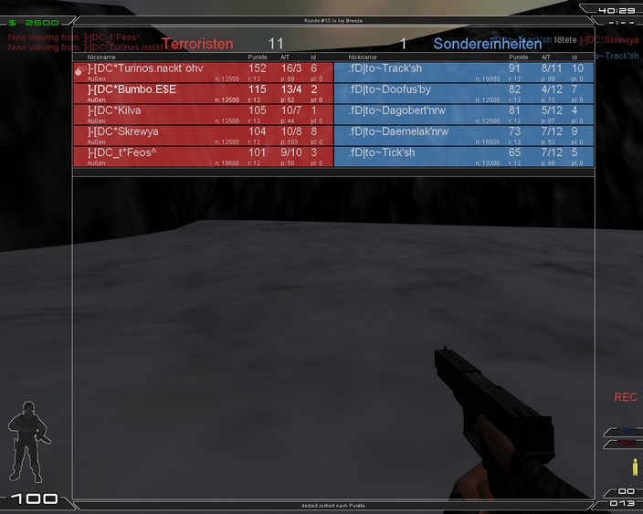 | Bericht | Erste Map ICY Breeze Lief einwandfrei als Terror. Außer die erste Runde, die verkackten wir. Als SF standen wir auch sehr gut und ließen nur 2 Rushs durchkommen und hatten somit schon 21 Runden geholt. Ausgegebens Ziel war 18-20 was somit übertroffen wurde. Zweite Map Winter Ransom Auf Terror lief es in den ersten paar Runden gut und hatten dann den Sieg in der Tasche. Auf Swat hatten wir grosse Probleme uns durchzusetzen und hatten dann auch viele Punkte verschenkt. Vielen Dank an die Enten für das Lame- und Flamefreie Match. |