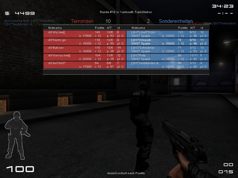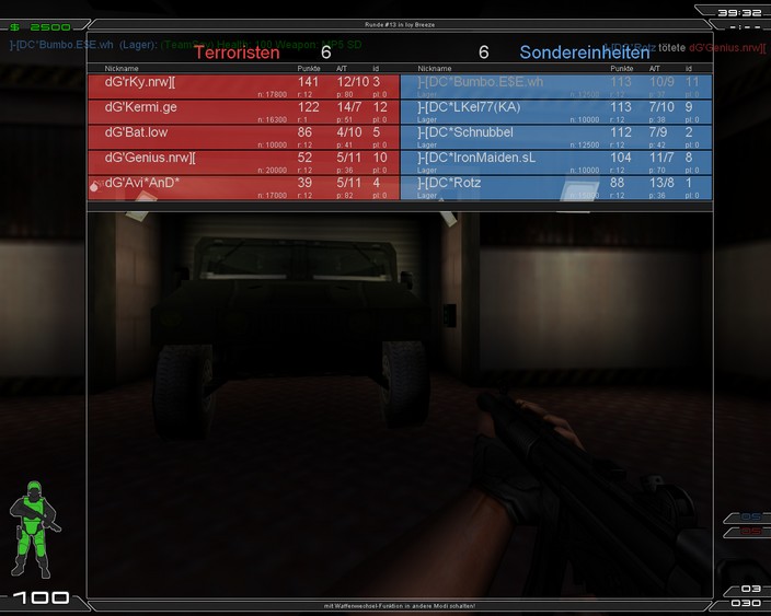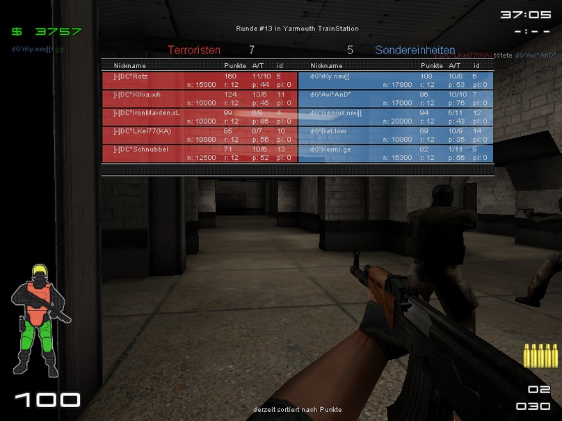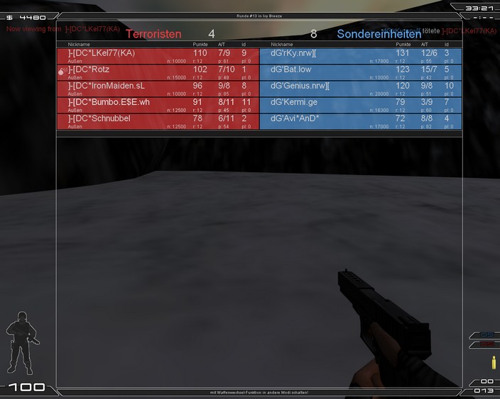 | Bericht | Funmatch gegen damn Gaming... Der Gegner musste sich erstmal gedulden, da uns der 5. Mann fehlte. Doch mit einem Anruf konnten wir Rotz um Hilfe bitten. Spontan entschied er sich um mitzuzocken. Thx nochmals an Rotz und natürlich auch an damn Gaming für das lange warten. Nun konnte es beginnen... Trainstation Terror waren die Posis gut platziert und der Gegner hatte schon einige Probleme dort durchzukommen. Mit einem Punktestand von 7:5 holten wir die Punkte nach Hause. Auf Swat lief es dann ein bisschen anders^^ dG gab uns kaum eine Chance bei denen durchzubrechen und somit holten wir nur 2:10 Punkte. Auf ICY sprang dann Bumbo für den kranken Kilva ein (ich [Bumbo] wurde auch angerufen^^ war aber zu spät für die erste Map da) Als Terror ging es ganz gut los, doch im weitern Warverlauf steigerte dG ihre Leistung bzw. ihre Waffen wurden dicker, was es uns nicht leichter machte. 4 Runden konnte wir holen. Als SF haben wir am Anfang ein wenig umgestellt... mit wenig Erfolg 0/3 naja für so was ist ja ein FM da. Mit den alten Posis bzw Taktik ging es dann doch wieder besser und wir konnten uns noch ein 6/6 erkämpfen! Danke an dG für diese Lame und Flamefrei Match! Nochmal sorry, das wir euch warten lassen haben ![]() |