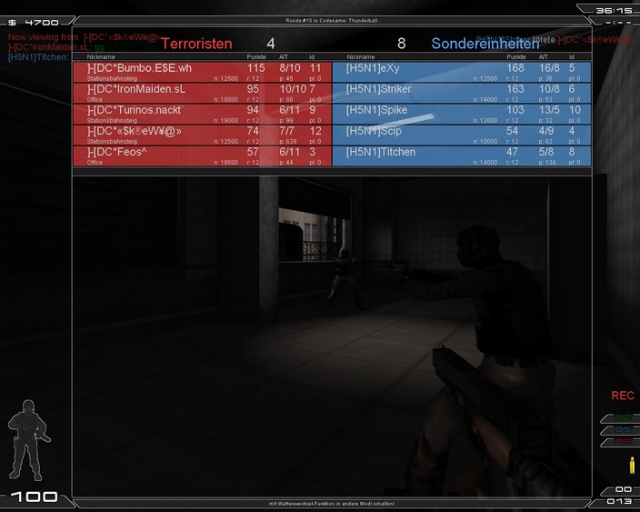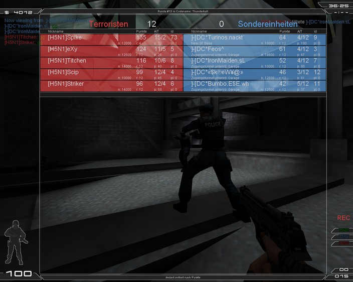 ]. Wir holten gute 8 Runden auf der Terrorseite und gingen frohen Mutes auf die SF Seite, die wir normal besser drauf haben. Doch irgendwie haben wir den Faden verloren. Viel ging nicht mehr und wir holten enttäuschende 5 Runden. Damit hatten wir unser Ziel verfehlt, ein kleines Polster für Thunderball zu holen. Als Terror ging es auch gleich schlecht los und wir verloren die Pistolen Runden... naja es ging so weiter, die Def. Taktik ging gar nicht auf... h5n1 war irgendwie den kleinen Tick besser. Wir holten nur ganz schwache 4 Ründchen. Damit war das Match schon so gut wie verloren. Als SF fanden wir ebenfalls keine Mittel gegen h5n1 und holten keine Runden.