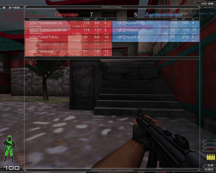 Auf Blister ging es gleich ganz schlecht für uns los. Schnell führte FZ mit 6/2, doch dann besonnten wir uns auf unsere stärken und holten die letzten 4 Runden. Auf Terror lief es auch nicht gerade gut. Ein paar verpeilte Runden usw. so dass wir nur 5 Runden holten. 11/13 für FZ kleiner Rückstand, sollte man auf Dragon machen können. Doch es wurde enger als gedacht! FZ hielt gut dagegen und macht uns das Leben verdammt schwer. Aber zum Teil machten wir uns das Leben auch extrem selber schwer. Nades und Laufwege müssen wir noch besser einüben bzw. absprechen. Beide Seiten waren sehr eng! SF gewannen wir mit 7/5 und bei Terror stand es 4/5, also braucht FZ nur noch eine Runde zum Draw... ein Glück hat da im War keiner dran gedacht^^ haben wir einfach mal einen Rush angesagt, der auch ein Glück klappte puuh! Nächste Runde noch mal und zack stand es 6/5 für uns! Draw war sicher. Jetzt blieben wir wieder in der Base und ließen FZ in unsere dicken Waffen laufen  BÄM 7/5 SIEG 25/23 wie immer sehr knapp
