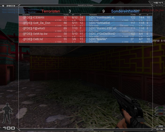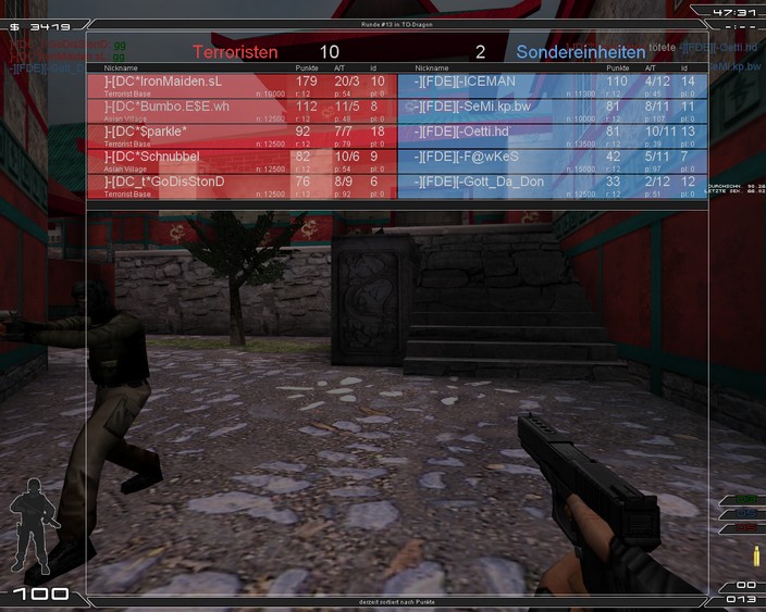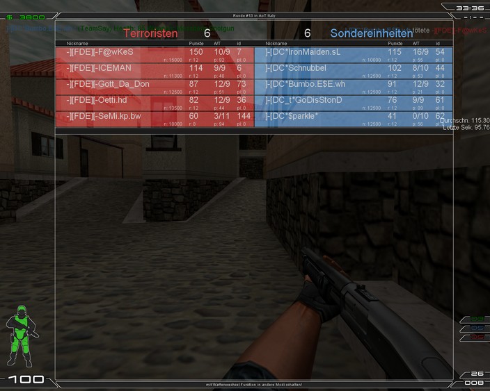 Auf Italy rushten wir als Terror wie Sau raus. Das brachte uns 11 Runden. Als SF mussten wir deren Base ausräuchern. Sie campten fast jede Runde... ekelhaft. Aber das brachte ihnen 6 Runden. Naja jeder muss selber wissen, wie er Erfolg hat und woran man Spaß hat.