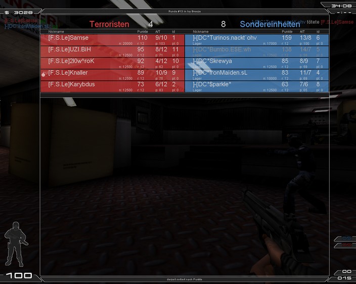 ^^ doch danach war nicht mehr viel drin. 2 Sniper am Gitter vorbei, einer direkt hinter dem Gitter der ca. 10 Nades hatte, die er uns beim Vorlaufen fangen ließ... auf dem Dach die letzten Zwei, die gekonnt Nades in den Fahrstuhlschacht fallen ließen. Zweikämpfe? Aktion? Fehlanzeige... auf Punktsnipern und ab und zu mal eine Nade... das macht ja riesig Spaß! Na ja der Erfolg gab F.S.Le. recht! Sie gewannen ihre erste Mapseite sogar so hoch 11/1, das es für den Warsieg reichte. Glückwunsch! Das nächste Mal mach ich def. nicht bei einem FM mit, indem ihr diese "tolle aktiongeladene" Map spielt