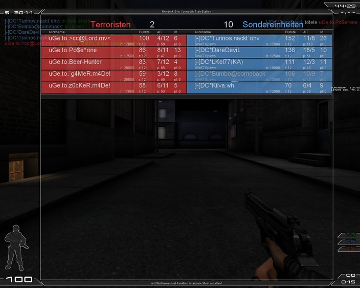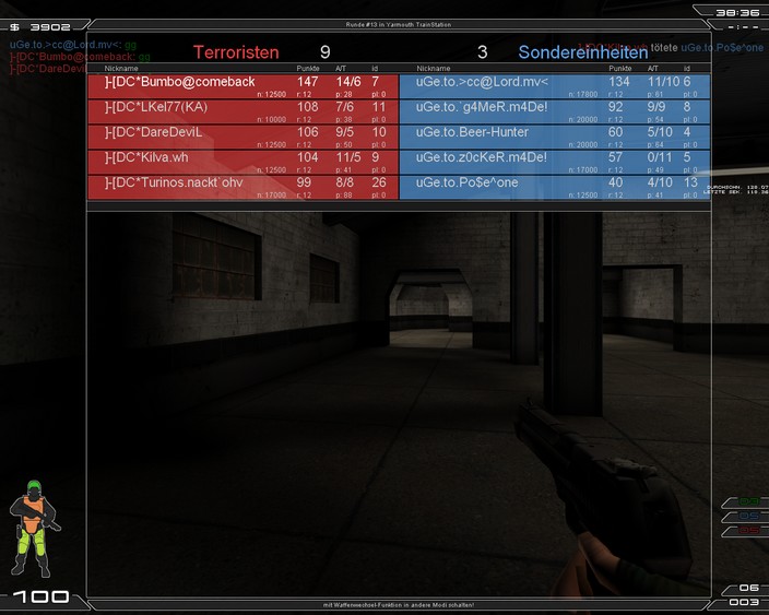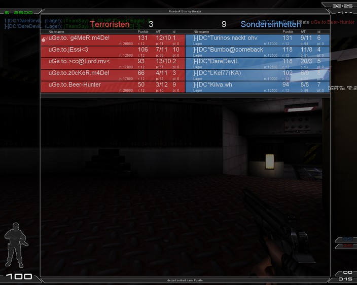 | Bericht | Sieg mehr schreib ich nicht, weil Kilva sonst wieder alles editiert ![]() ok war ein Scherz! Fangen wir mal mit dem wichtigsten ein, Bumbo.... ![]() nein ok dem Warbericht ![]() Auf Icy lief es erstaunlich flüssig. Wir spielten sehr variabel und konnte uge damit das ein oder andere Mal überraschen bzw eigentlich immer^^ Klappte prima die Terrorseite. Als wir dann auf SF wechselten, wurden wir ein wenig nachlässig und verloren ein paar Runden, konnten uns aber wieder sammeln und die Map sicher mit 20/4 nach Hause holen. Auf Trainstation fingen wir wieder gut an, standen in der Verteidigung sicher und konnten die meisten Angriffe erfolgreich abwehren. Als SF lief es diesmal einwandfrei. Wir spielten die Runden gut runter und konnten erstaunliche 10 Runden holen. Danke an uge für dieses lame und flamefrei Match! Gerne mal wieder |