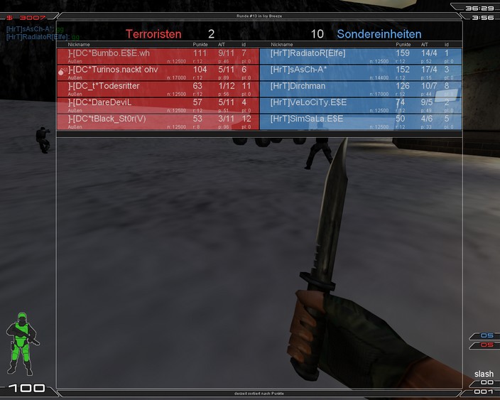 | Bericht | Heute ging es gegen HrT den ex Clan von DareDevil! Da wir gestern HcD hoch geschlagen haben, dachte sich HrT wohl, auch mit einem guten Team kommen zu müssen (hat wohl nur einer von 1. XGC Lineup gefehlt). Was sie nicht wussten, das wir diesmal mit ganz neuer Aufstellung antraten. Dies hatte zur folge, das wir diesmal schön aufn bekommen haben. Auf Geta waren die Gegner nicht in den Griff zu bekommen. Desweiteren waren wir mehr damit beschäftig Waffen zu verkaufen, anstatt die Gegner zu jagen... Taktische Fehler ohne Ende taten den Rest und somit hatte HrT leichtes Spiel. Beide Seiten gewannen sie deutlich mit 9:3.Auf Icy hofften wir auf Besserung, aber diese Map kann man nur mit gut eingespielten Team ownen. Diemal hatten wir dies nicht und zusätzlich einen am heutigen Tag übermächtigen Gegner. Mit 2 taktischen Tricks, konnten wir uns 2 Ründchen klauen... sehr bitter. Auf SF schmierte DareDevil sein PC am. Genau am Rundeende (Stand: 8:28), sein PC wollte auch nicht mehr hochfahren und so mussten wir Hammer einwechseln! Mit ihm ging es dann auch ein bisschen besser, auf der leichteren SF Seite. Trotzdem konnten wir nur 5 Runden holen. Danke an HrT für das lame- und flamefreie Match PS @einen HrTler: Nur weil Turi eine Runde mal abgeht (bei riesen Rückstand), muss man nicht NC schreiben... glaubst du wirklich, dass er für eine Runde nochmal an macht?? Erst denken, dann schreiben bzw. Teamsay ![]() |