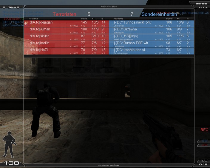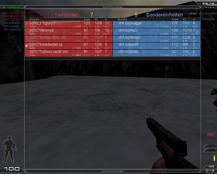 nach dieser Runde verlies der Fußballprofi vom VFL Wolfsburg gefrustet den Server... ein anderer tat es ihm gleich. Schade wir hätten gern gegen alle 5 zuende gespielt. Wenigstens hatten die letzten 3 Gegner den Anstand und sind bis zum Schluß drauf geblieben. Zu dritt hatten sie natürlich keine Chance mehr eine Runde zu holen. Somit besser wir unsere Turnierblianz weiter auf und stehen im Viertelfinal des dmZ Winter Revolition Cups
